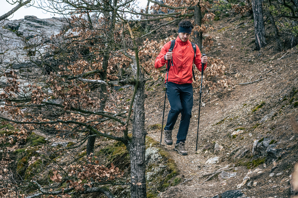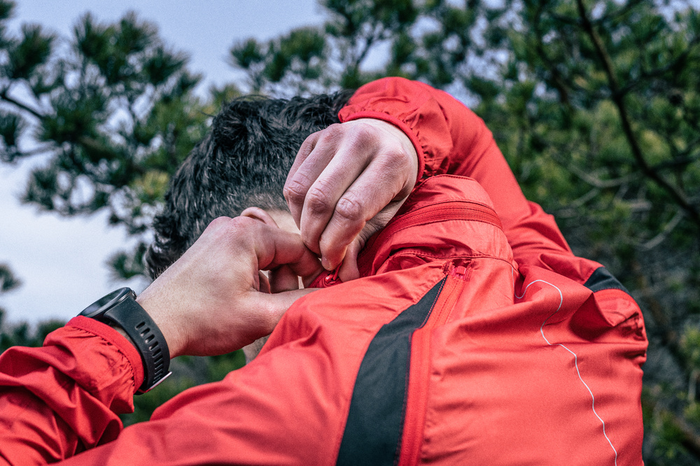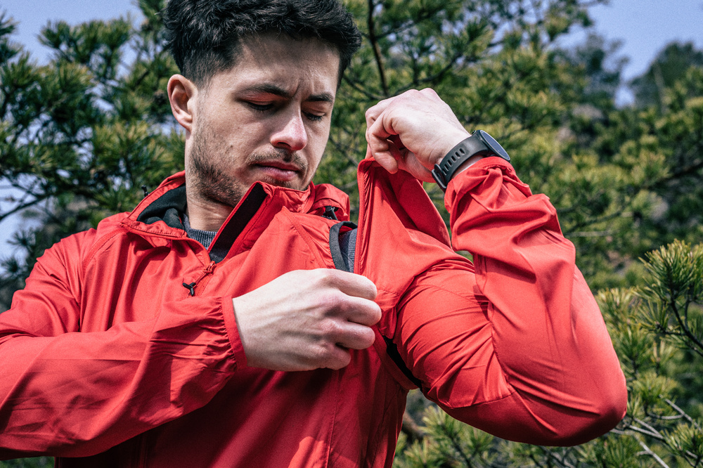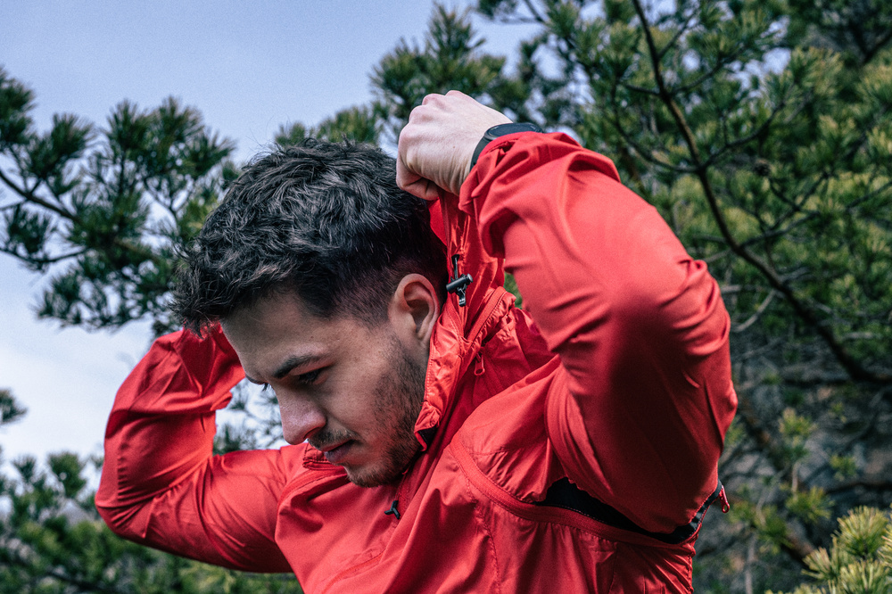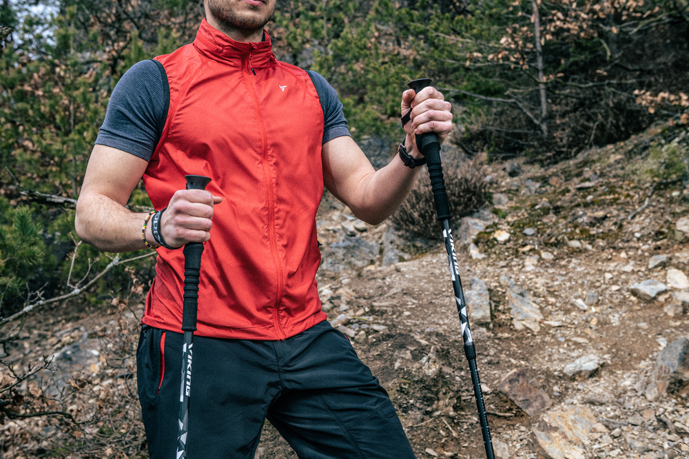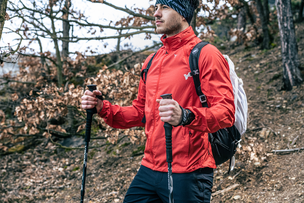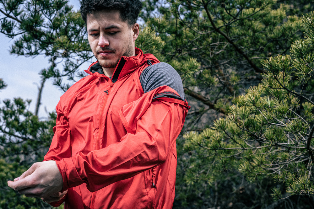 Lehká pánská bunda z větru vzdorného materiálu s odepínacími rukávy. Bundu je možné sbalit do malého sáčku, který se dá připevnit na rám kola. Bunda má kapuci, kterou lze složit do límce.