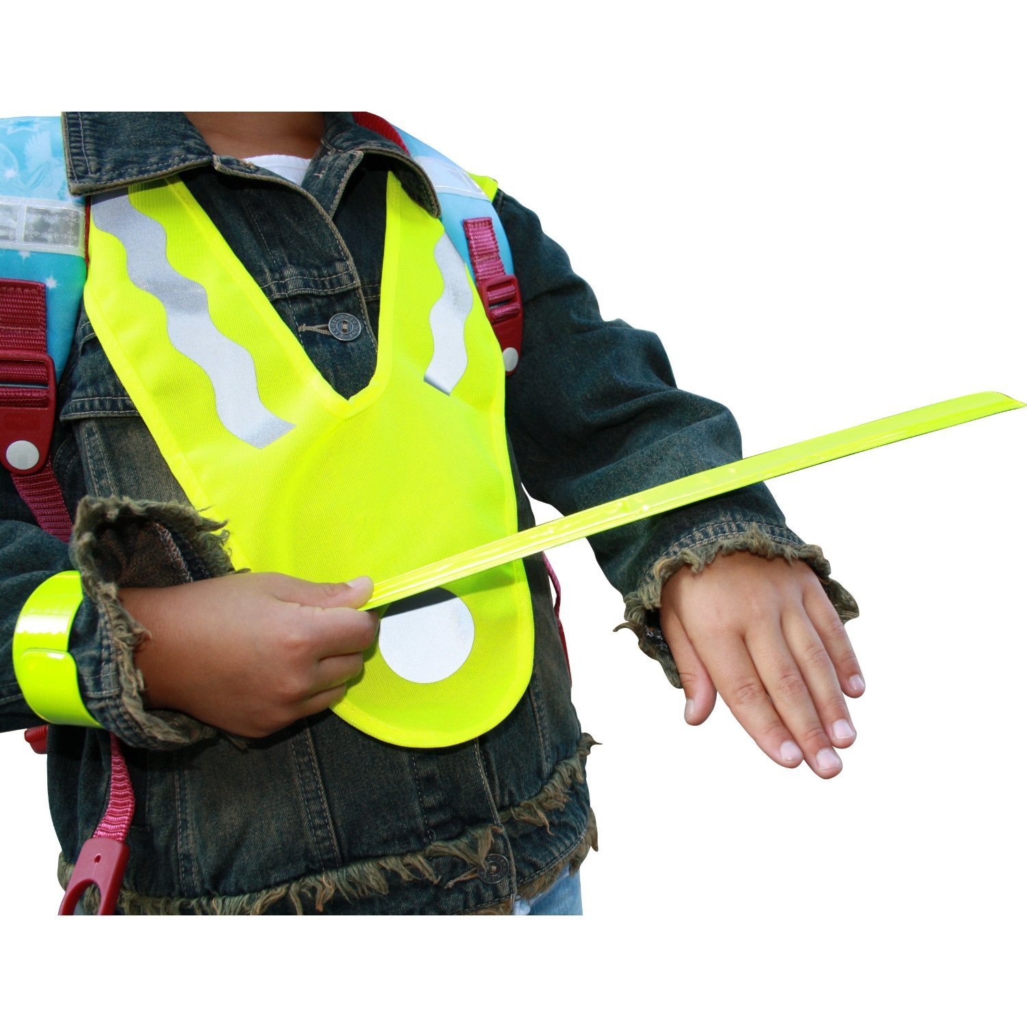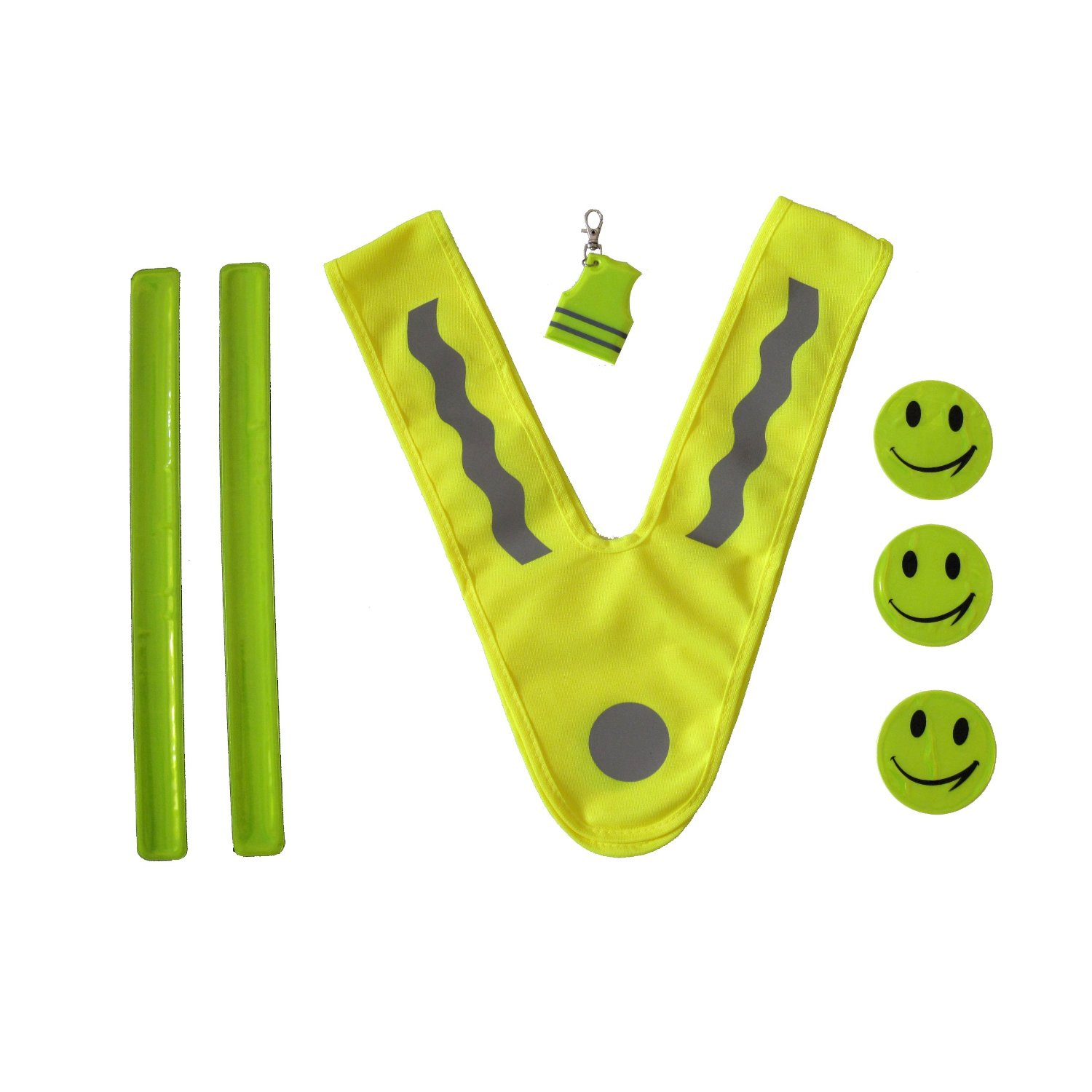 7-dílná sada se skládá z bezpečnostní vesty, 2 ohebné pásky pro ruce a nohy, 3 samolepky a 1 klíčenka