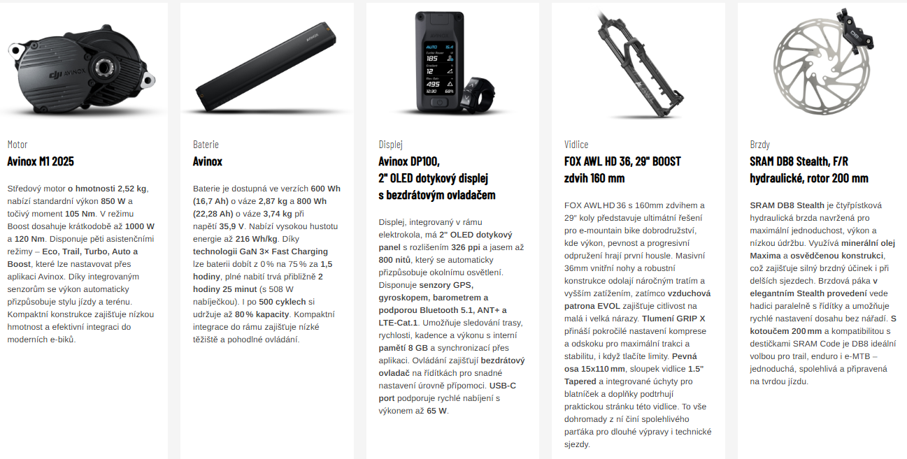Motor: Avinox M1 2025, 250W (MAX 1000W) 105 Nm (120 Nm v boost režimu)