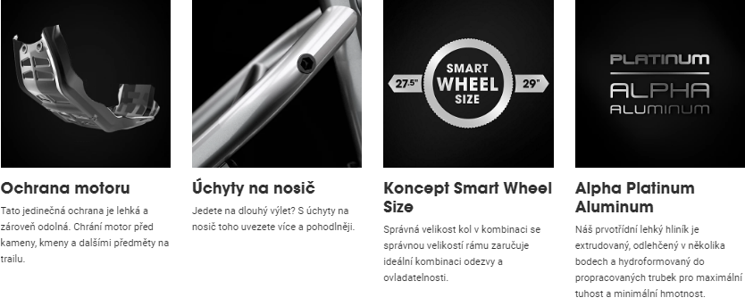 | Rám | Hliník Alpha Platinum, vyjímatelná integrovaná baterie (RIB), kónická hlavová trubka, vnitřní vedení lanek Control Freak, ochrana Motor Armor, Boost148. |