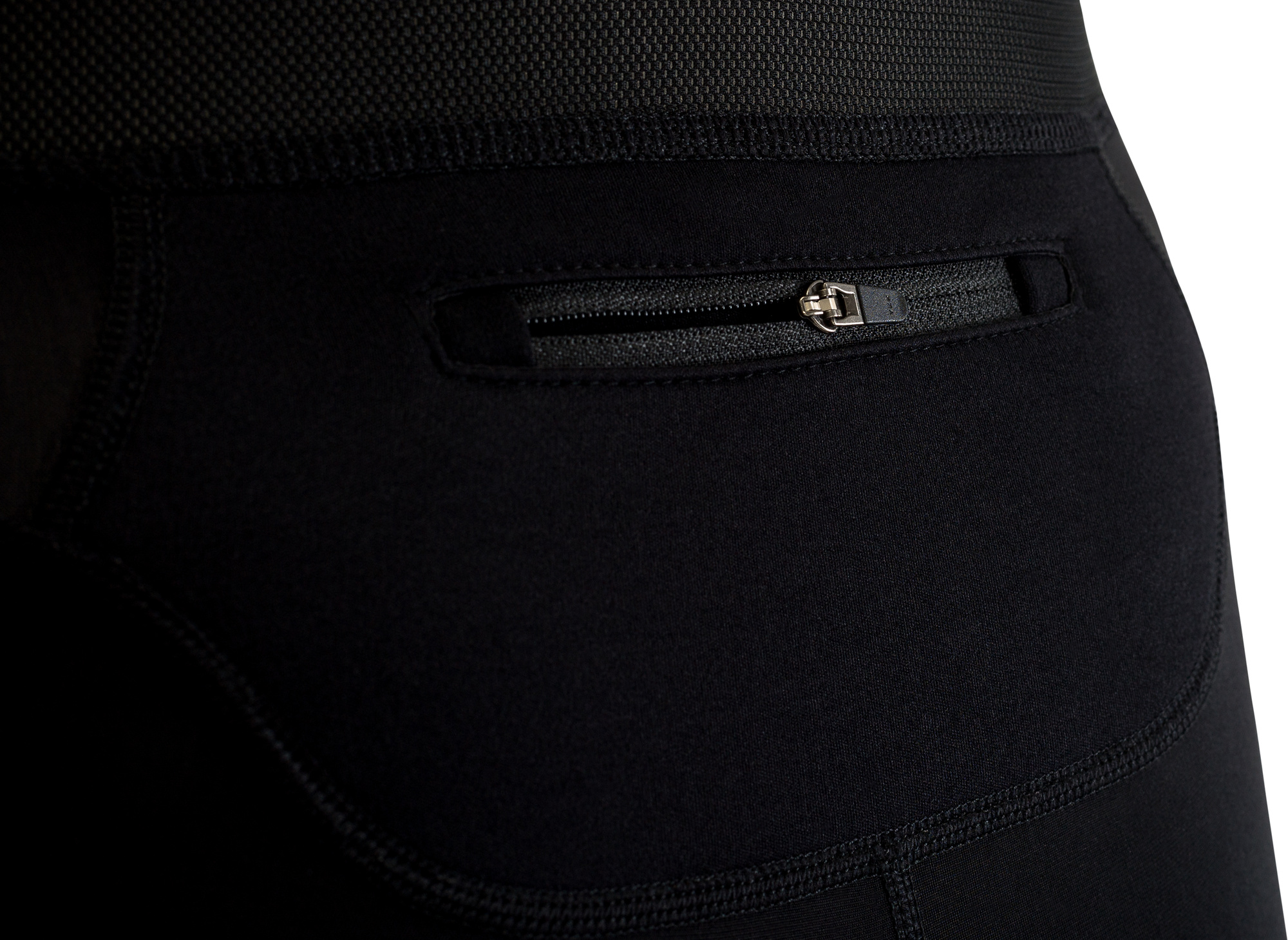reflexní prvky, kapsička na zip na zadním díle, zip v dolním kraji nohavic, plochý šev, protiskluzový silikonový pásek, elastický zadní díl u kalhot, rozepínání na zip u kalhot