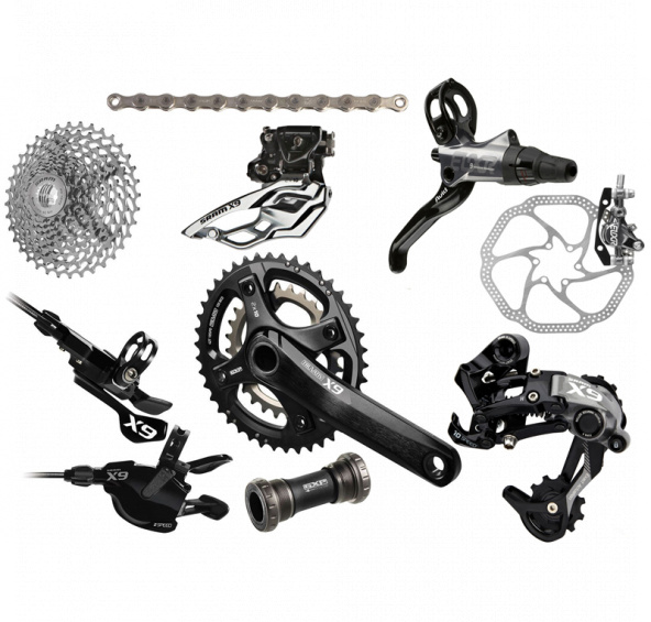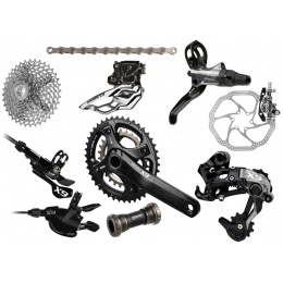 V této sadě je:- přehazovačka X9 TYPE2 s alu vodítkem- kliky X9 175mm s převodníky 39/26 zubů, včetně středových ložisek GXP- přesmykač X9 dual pull- kazeta PG 1050 11-36zubů- brzdy Avid Elixir 9 s karbonovými pákami, kotouče 160mm- řetěz PC 1051- řazení X9 2x10 rychlostí
