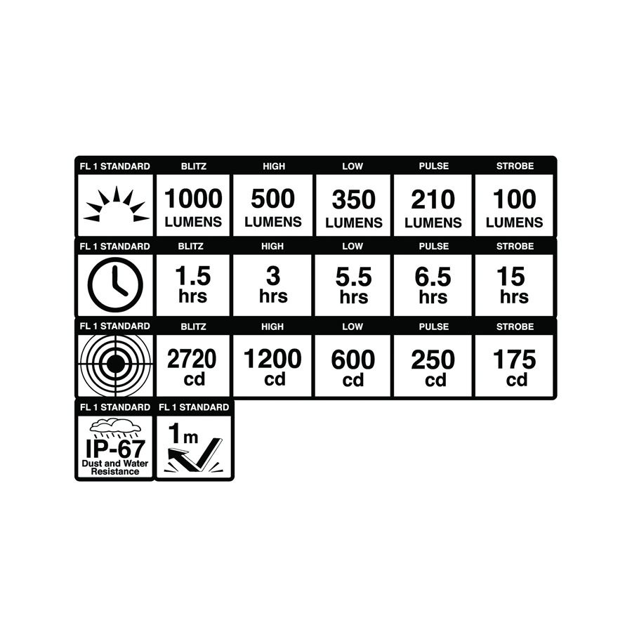 MÓDY Blitz 1000 lumenů/1,5 h, High 500 lumenů/3 h, Low 350 lumenů/5,5 h, Pulse 210 lumenů/6,5 h, Strobe 100 lumenů/15 h